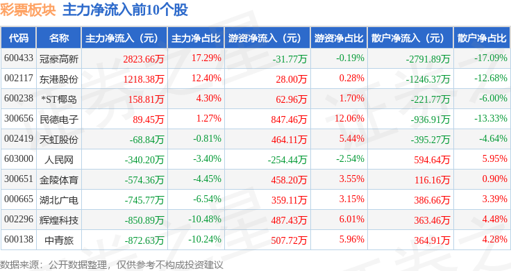 从资金流向上来看,当日彩票板块主力资金净流出1.84亿元,游资资金净流入7552.73万元,散户资金净流入1.08亿元。彩票板块个股资金流向见下表: