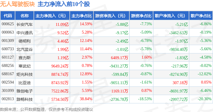 从资金流向上来看,当日无人驾驶板块主力资金净流出26.99亿元,游资资金净流入5.43亿元,散户资金净流入21.56亿元。无人驾驶板块个股资金流向见下表:
