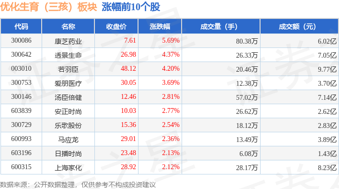从资金流向上来看,当日优化生育(三孩)板块主力资金净流出10.06亿元,游资资金净流入3.09亿元,散户资金净流入6.96亿元。优化生育(三孩)板块个股资金流向见下表: