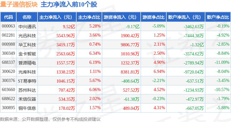 从资金流向上来看,当日量子通信板块主力资金净流出6.75亿元,游资资金净流出3954.76万元,散户资金净流入7.15亿元。量子通信板块个股资金流向见下表: