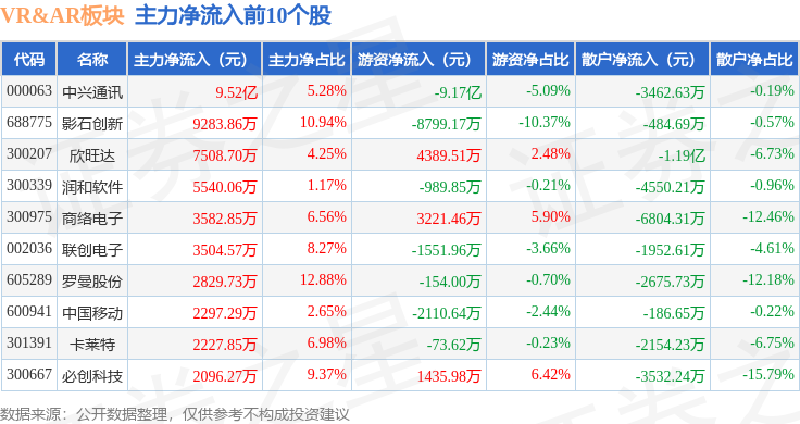 从资金流向上来看,当日VR&AR板块主力资金净流出45.73亿元,游资资金净流入6.33亿元,散户资金净流入39.41亿元。VR&AR板块个股资金流向见下表: