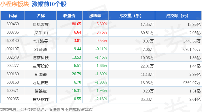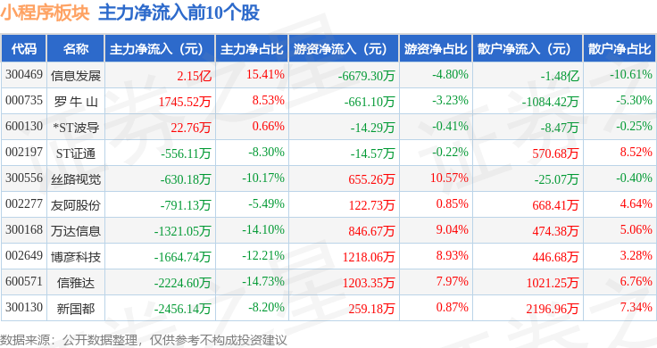 从资金流向上来看,当日小程序板块主力资金净流出6.69亿元,游资资金净流出4309.22万元,散户资金净流入7.12亿元。小程序板块个股资金流向见下表: