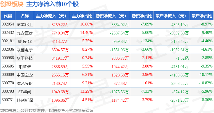 从资金流向上来看,当日创投板块主力资金净流出29.01亿元,游资资金净流入6.34亿元,散户资金净流入22.67亿元。创投板块个股资金流向见下表: