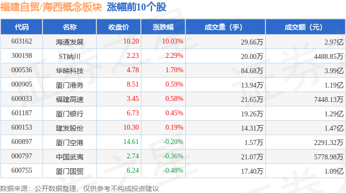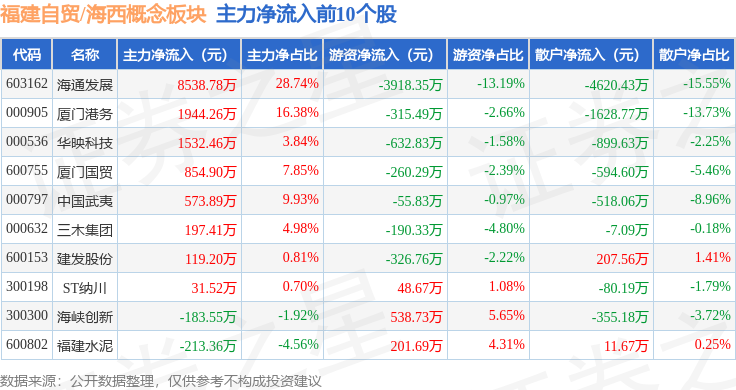从资金流向上来看,当日福建自贸/海西概念板块主力资金净流出1.65亿元,游资资金净流出3125.86万元,散户资金净流入1.97亿元。福建自贸/海西概念板块个股资金流向见下表: