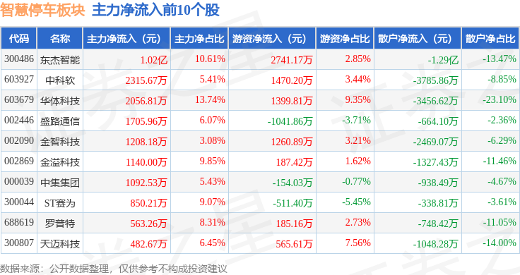 从资金流向上来看,当日智慧停车板块主力资金净流出4.0亿元,游资资金净流入2.23亿元,散户资金净流入1.77亿元。智慧停车板块个股资金流向见下表: