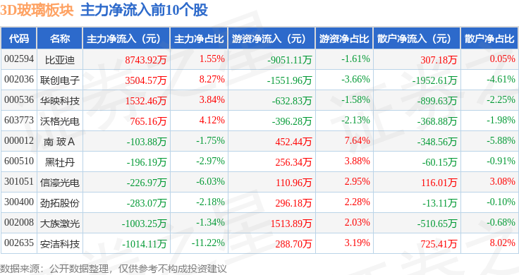 从资金流向上来看,当日3D玻璃板块主力资金净流出8.82亿元,游资资金净流入1.85亿元,散户资金净流入6.97亿元。3D玻璃板块个股资金流向见下表: