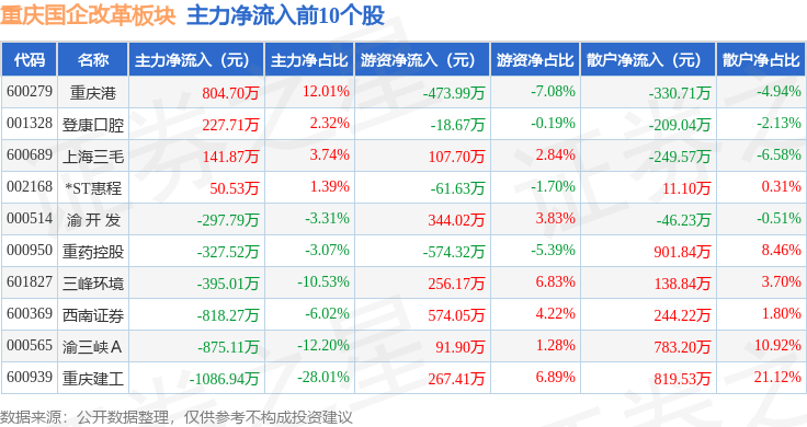 从资金流向上来看,当日重庆国企改革板块主力资金净流出1.39亿元,游资资金净流入2441.38万元,散户资金净流入1.15亿元。重庆国企改革板块个股资金流向见下表: