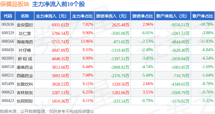从资金流向上来看,当日保健品板块主力资金净流出6483.67万元,游资资金净流入1115.64万元,散户资金净流入5368.02万元。保健品板块个股资金流向见下表: