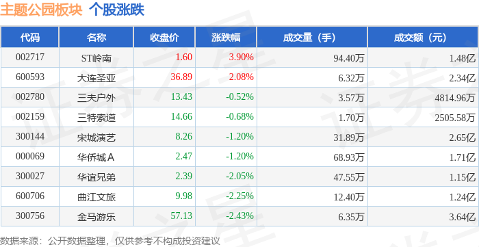 从资金流向上来看,当日主题公园板块主力资金净流出4002.74万元,游资资金净流入1398.73万元,散户资金净流入2604.01万元。主题公园板块个股资金流向见下表: