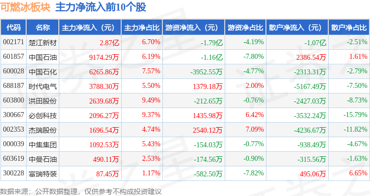 从资金流向上来看,当日可燃冰板块主力资金净流入3.21亿元,游资资金净流出2.48亿元,散户资金净流出7317.93万元。可燃冰板块个股资金流向见下表: