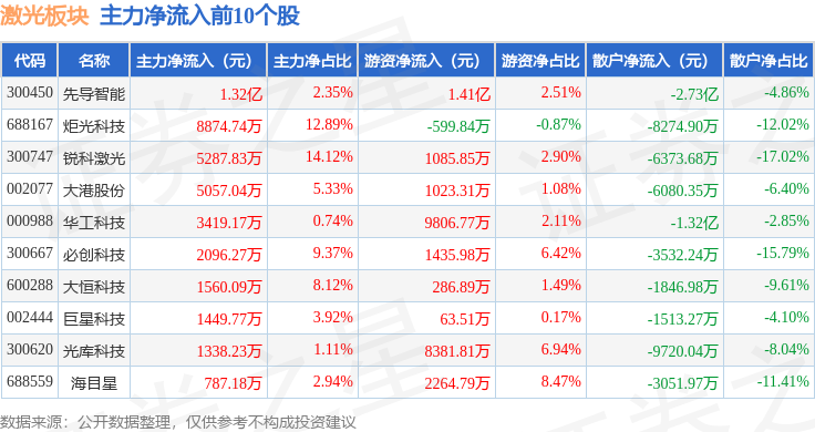 从资金流向上来看,当日激光板块主力资金净流出2.53亿元,游资资金净流入5.46亿元,散户资金净流出2.93亿元。激光板块个股资金流向见下表: