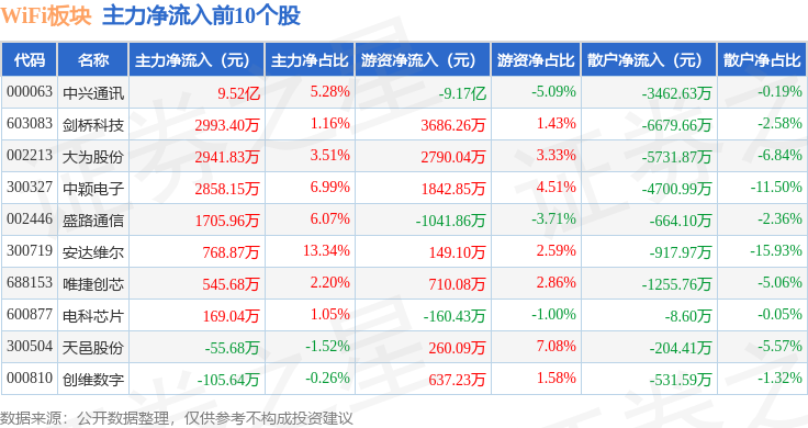 从资金流向上来看,当日WiFi板块主力资金净流入2928.51万元,游资资金净流出1.44亿元,散户资金净流入1.15亿元。WiFi板块个股资金流向见下表: