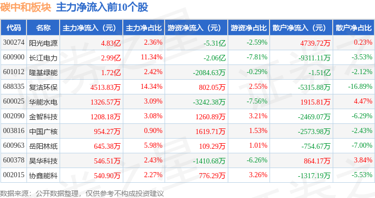 从资金流向上来看,当日碳中和板块主力资金净流出14.22亿元,游资资金净流出4.3亿元,散户资金净流入18.52亿元。碳中和板块个股资金流向见下表: