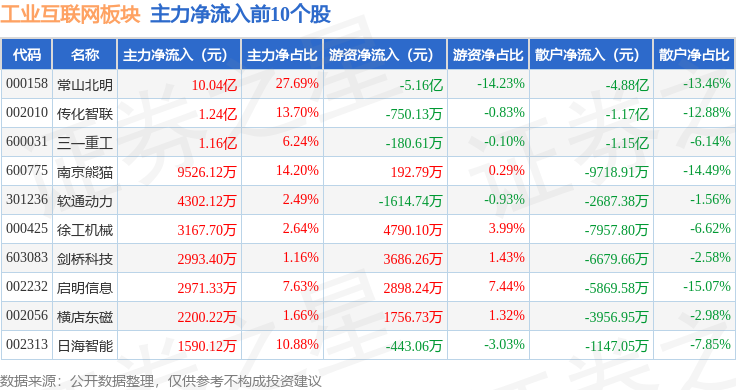 从资金流向上来看,当日工业互联网板块主力资金净流出69.71亿元,游资资金净流入17.74亿元,散户资金净流入51.96亿元。工业互联网板块个股资金流向见下表: