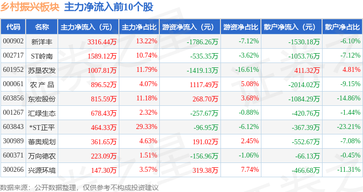 从资金流向上来看,当日乡村振兴板块主力资金净流出5.17亿元,游资资金净流入1.02亿元,散户资金净流入4.15亿元。乡村振兴板块个股资金流向见下表: