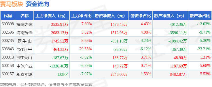从资金流向上来看,当日赛马板块主力资金净流出5524.05万元,游资资金净流入4864.87万元,散户资金净流入659.18万元。赛马板块个股资金流向见下表: