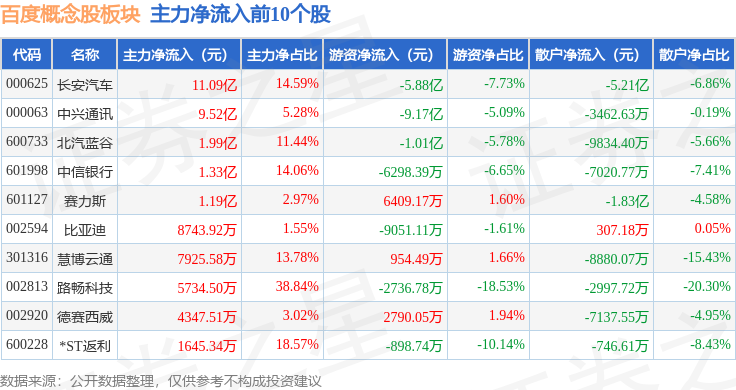 从资金流向上来看,当日百度概念股板块主力资金净流出4846.97万元,游资资金净流出7.44亿元,散户资金净流入7.92亿元。百度概念股板块个股资金流向见下表: