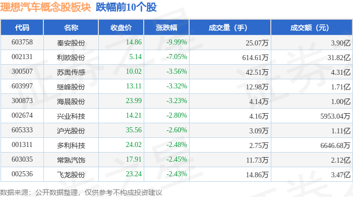 证券之星消息,10月16日理想汽车概念股板块较上一交易日下跌1.05%,秦安股份领跌。当日上证指数报收于3916.23,上涨0.1%。深证成指报收于13086.41,下跌0.25%。理想汽车概念股板块个股涨跌见下表: