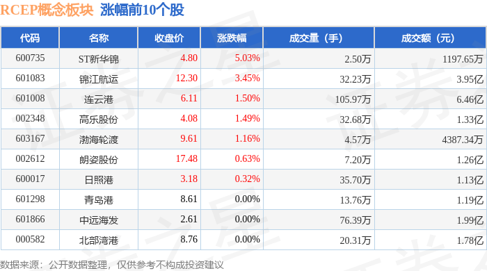 证券之星消息,10月16日RCEP概念板块较上一交易日下跌0.49%,海川智能领跌。当日上证指数报收于3916.23,上涨0.1%。深证成指报收于13086.41,下跌0.25%。RCEP概念板块个股涨跌见下表:
