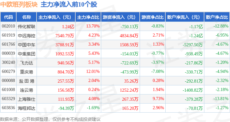 从资金流向上来看,当日中欧班列板块主力资金净流入4857.54万元,游资资金净流入1.4亿元,散户资金净流出1.88亿元。中欧班列板块个股资金流向见下表: