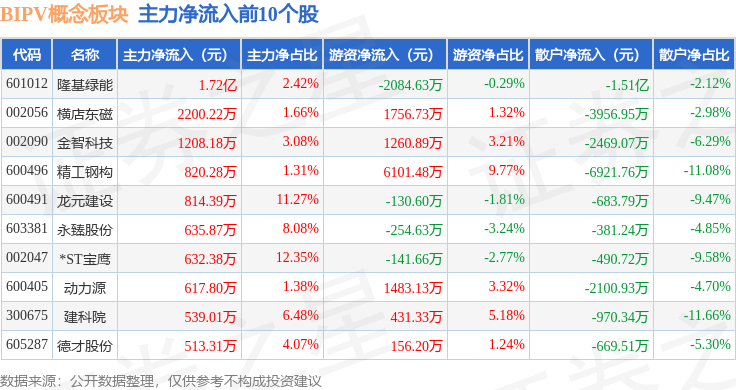 从资金流向上来看,当日BIPV概念板块主力资金净流出9.37亿元,游资资金净流入2.36亿元,散户资金净流入7.02亿元。BIPV概念板块个股资金流向见下表:
