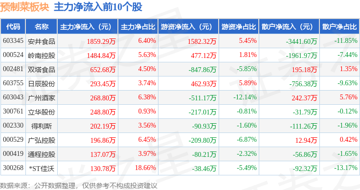 从资金流向上来看,当日预制菜板块主力资金净流出7.07亿元,游资资金净流入1.44亿元,散户资金净流入5.62亿元。预制菜板块个股资金流向见下表: