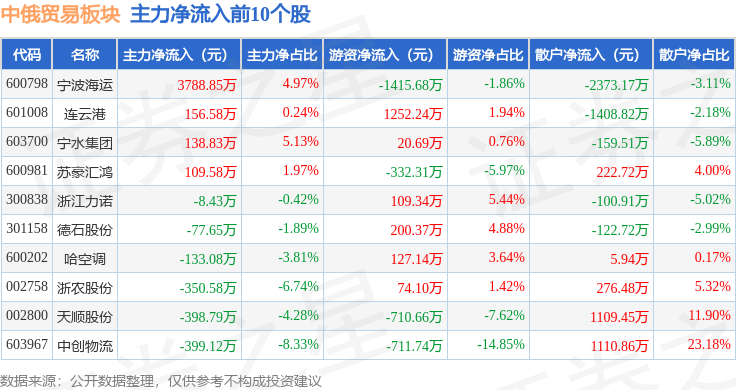 从资金流向上来看,当日中俄贸易板块主力资金净流出1.57亿元,游资资金净流入3804.69万元,散户资金净流入1.19亿元。中俄贸易板块个股资金流向见下表: