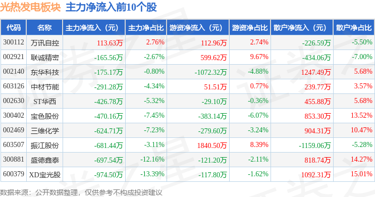 从资金流向上来看,当日光热发电板块主力资金净流出11.8亿元,游资资金净流入2117.74万元,散户资金净流入11.59亿元。光热发电板块个股资金流向见下表:
