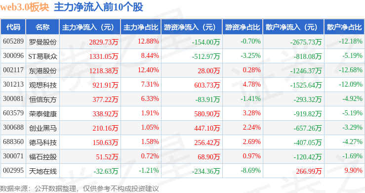 从资金流向上来看,当日web3.0板块主力资金净流出7.57亿元,游资资金净流入2.04亿元,散户资金净流入5.53亿元。web3.0板块个股资金流向见下表: