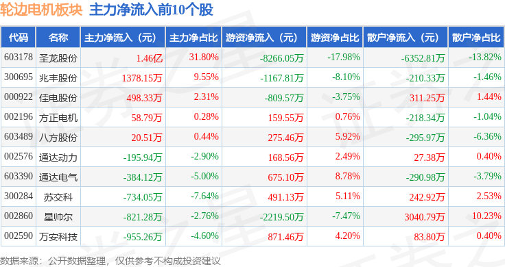 从资金流向上来看,当日轮边电机板块主力资金净流出7.35亿元,游资资金净流入3894.67万元,散户资金净流入6.96亿元。轮边电机板块个股资金流向见下表: