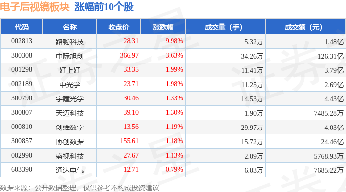 证券之星消息,10月16日电子后视镜板块较上一交易日上涨0.42%,路畅科技领涨。当日上证指数报收于3916.23,上涨0.1%。深证成指报收于13086.41,下跌0.25%。电子后视镜板块个股涨跌见下表: