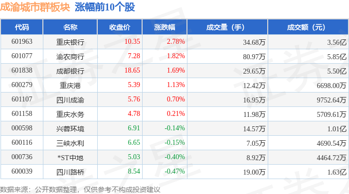 证券之星消息,10月16日成渝城市群板块较上一交易日上涨0.15%,重庆银行领涨。当日上证指数报收于3916.23,上涨0.1%。深证成指报收于13086.41,下跌0.25%。成渝城市群板块个股涨跌见下表: