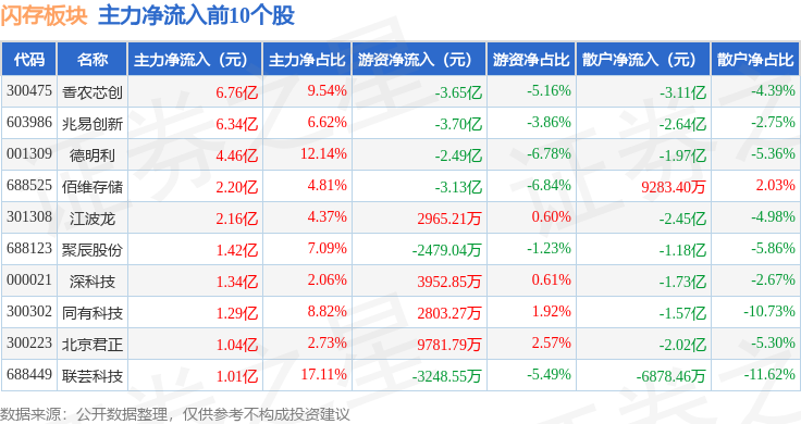 从资金流向上来看,当日闪存板块主力资金净流入22.86亿元,游资资金净流出5.25亿元,散户资金净流出17.61亿元。闪存板块个股资金流向见下表: