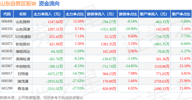 从资金流向上来看,当日山东自贸区板块主力资金净流出5245.09万元,游资资金净流入516.11万元,散户资金净流入4728.98万元。山东自贸区板块个股资金流向见下表: