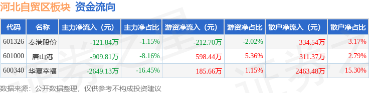 从资金流向上来看,当日河北自贸区板块主力资金净流出3680.78万元,游资资金净流入571.39万元,散户资金净流入3109.39万元。河北自贸区板块个股资金流向见下表: