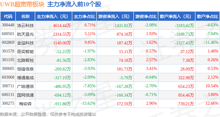 从资金流向上来看,当日UWB超宽带板块主力资金净流出3.96亿元,游资资金净流入2.2亿元,散户资金净流入1.76亿元。UWB超宽带板块个股资金流向见下表:
