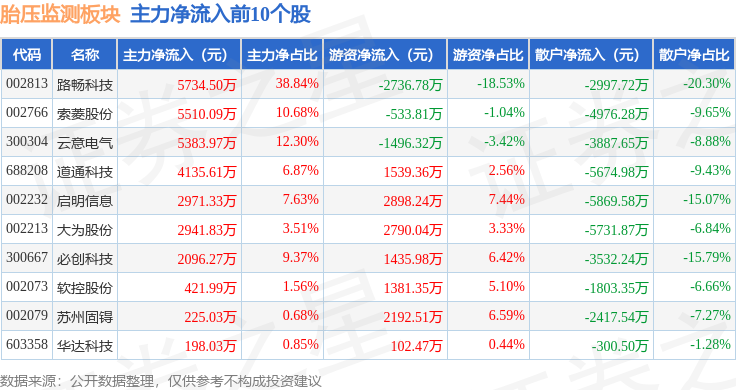 从资金流向上来看,当日胎压监测板块主力资金净流入1.21亿元,游资资金净流入1.69亿元,散户资金净流出2.89亿元。胎压监测板块个股资金流向见下表: