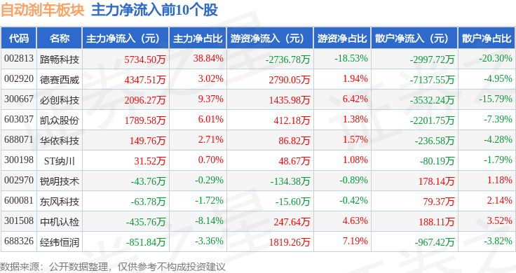 从资金流向上来看,当日自动刹车板块主力资金净流出6.53亿元,游资资金净流入3.5亿元,散户资金净流入3.03亿元。自动刹车板块个股资金流向见下表: