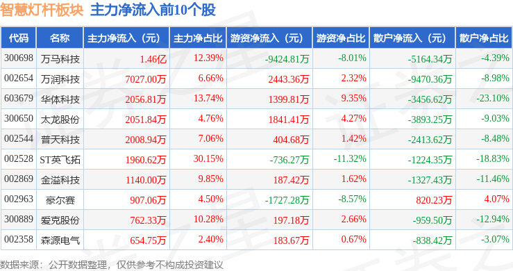 从资金流向上来看,当日智慧灯杆板块主力资金净流出4.4亿元,游资资金净流入6323.77万元,散户资金净流入3.77亿元。智慧灯杆板块个股资金流向见下表: