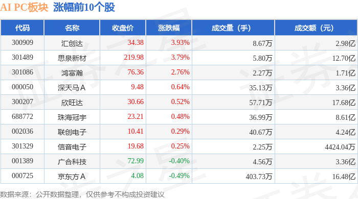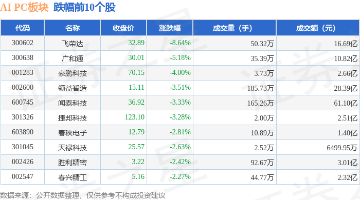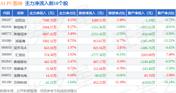 从资金流向上来看,当日AI PC板块主力资金净流出16.95亿元,游资资金净流入3.92亿元,散户资金净流入13.03亿元。AI PC板块个股资金流向见下表: