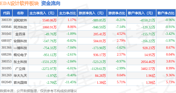 从资金流向上来看,当日EDA设计软件板块主力资金净流出4.64亿元,游资资金净流入1.18亿元,散户资金净流入3.46亿元。EDA设计软件板块个股资金流向见下表: