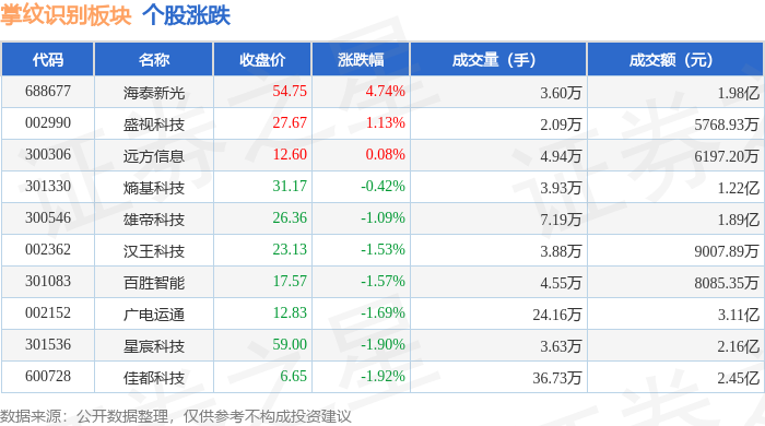 从资金流向上来看,当日掌纹识别板块主力资金净流出9680.29万元,游资资金净流入4414.51万元,散户资金净流入5265.78万元。掌纹识别板块个股资金流向见下表: