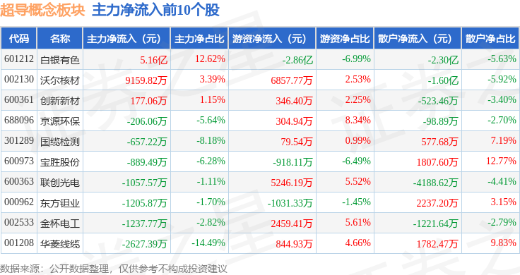 从资金流向上来看,当日超导概念板块主力资金净流出6.59亿元,游资资金净流出4062.57万元,散户资金净流入6.99亿元。超导概念板块个股资金流向见下表: