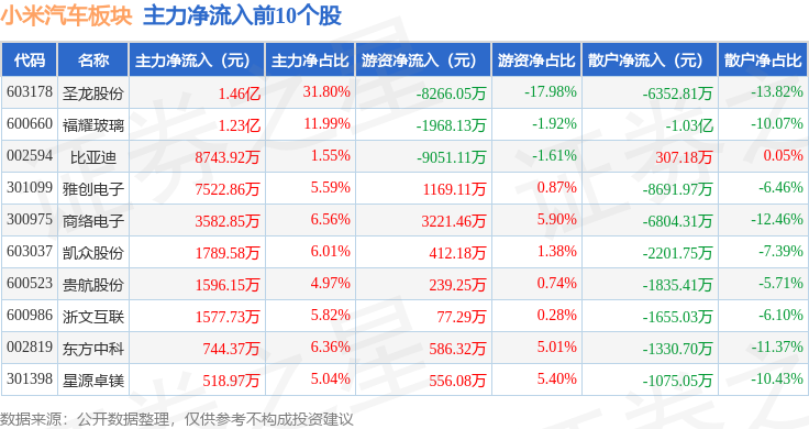 从资金流向上来看,当日小米汽车板块主力资金净流出14.79亿元,游资资金净流入7.5亿元,散户资金净流入7.29亿元。小米汽车板块个股资金流向见下表:
