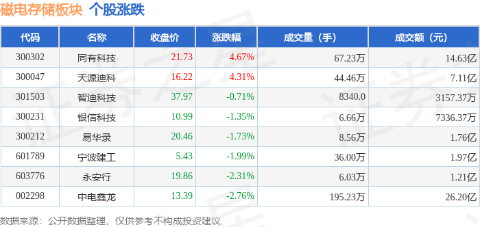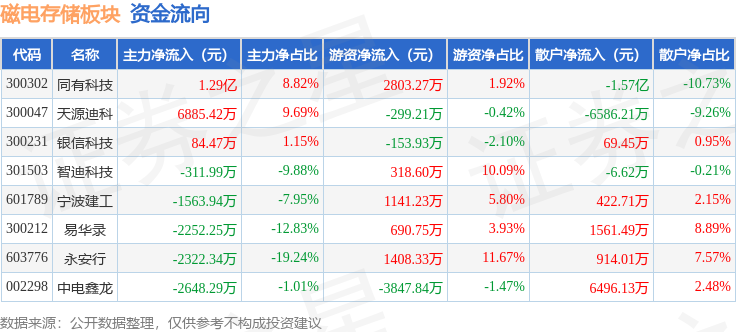 从资金流向上来看,当日磁电存储板块主力资金净流入1.08亿元,游资资金净流入2061.22万元,散户资金净流出1.28亿元。磁电存储板块个股资金流向见下表: