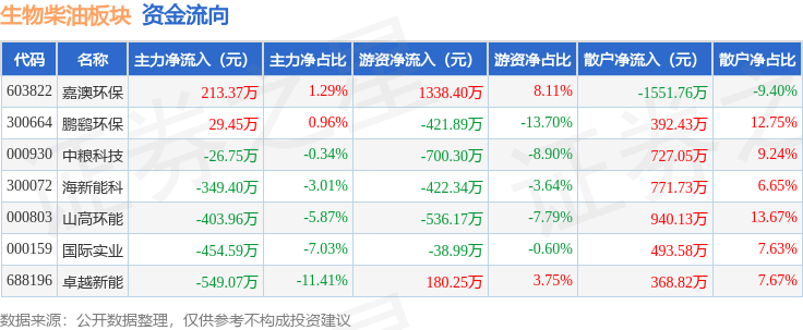 从资金流向上来看,当日生物柴油板块主力资金净流出1540.94万元,游资资金净流出601.05万元,散户资金净流入2141.99万元。生物柴油板块个股资金流向见下表: