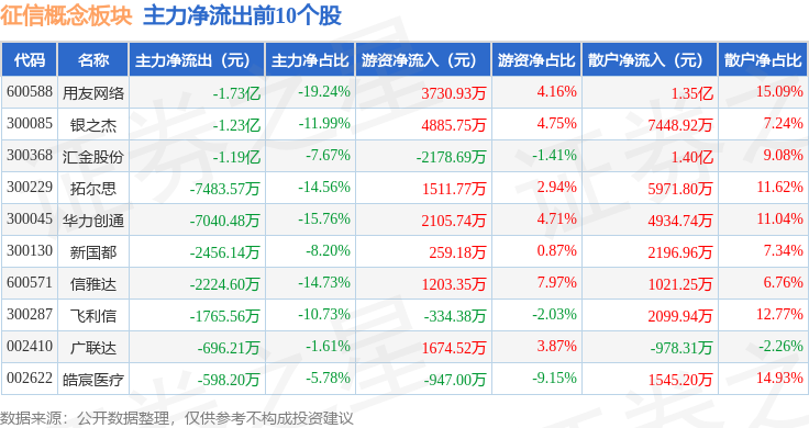 从资金流向上来看,当日征信概念板块主力资金净流出6.44亿元,游资资金净流入1.28亿元,散户资金净流入5.16亿元。征信概念板块个股资金流向见下表: