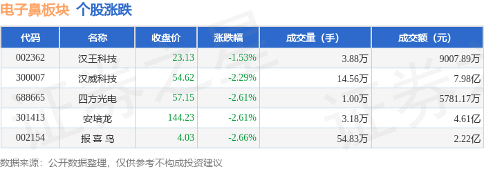 证券之星消息,10月16日电子鼻板块较上一交易日下跌2.36%,报 喜 鸟领跌。当日上证指数报收于3916.23,上涨0.1%。深证成指报收于13086.41,下跌0.25%。电子鼻板块个股涨跌见下表: