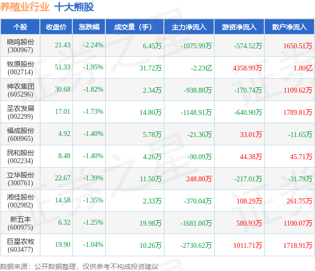 个股表现方面,养殖业行业当日领跌股为晓鸣股份(300967),该股当日报收21.43,下跌2.24%,成交量6.45万,主力资金净流出1075.99万元。牧原股份(002714)以下跌1.95%紧随其后,该股当日成交量31.72万,主力资金净流出2.23亿元。除此之外,神农集团(605296)、圣农发展(002299)、福成股份(600965)均进入当日熊股之列。具体个股列表见下表: