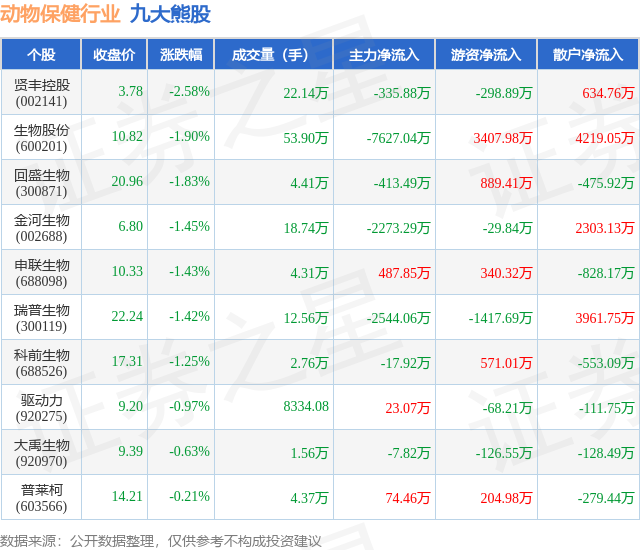 个股表现方面,动物保健行业当日领跌股为贤丰控股(002141),该股当日报收3.78,下跌2.58%,成交量22.14万,主力资金净流出335.88万元。生物股份(600201)以下跌1.9%紧随其后,该股当日成交量53.9万,主力资金净流出7627.04万元。除此之外,回盛生物(300871)、金河生物(002688)、申联生物(688098)均进入当日熊股之列。具体个股列表见下表: